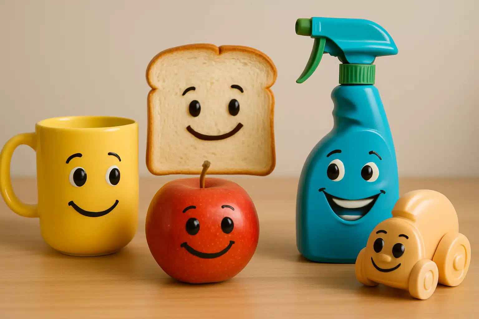 - Escolha objetos facilmente reconhecíveis (banana, copo, biscoito) para impacto imediato.